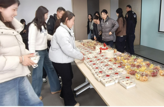 活动在公司职场内温馨举行,现场布置简洁而富有节日氛围。长桌上整齐摆放着寓意团圆美满的汤圆、精致水果拼盘及节日小点心,红彤彤的“福”字装饰与喜庆的职场布置交相辉映,处处洋溢着浓浓的年味。员工们有序领取节日餐点,脸上洋溢着幸福的笑容,彼此间亲切交谈,分享节日喜悦。