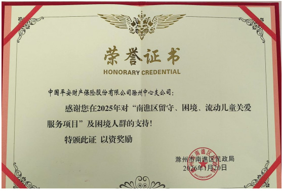 中国平安财产保险股份有限公司滁州中心支公司(以下简称“平安财险滁州中心支公司”)从滁州市南谯区民政局手中接过一份沉甸甸的《荣誉证书》,以表彰其在2025年度对“南谯区留守、困境、流动儿童关爱服务项目”及广大困境人群所作出的重要支持与贡献。这不仅是对企业社会责任的肯定,更是平安财险深耕本地、回馈社会的生动写照。