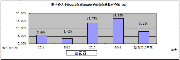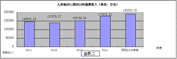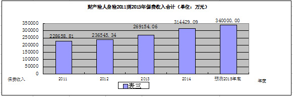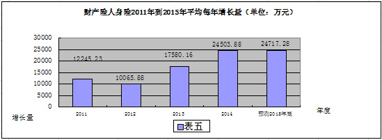 2015年是完成“十二五”规划的最后一年。目前,滁州保险公司29 家,其中财产险15家,人寿险14家;预计2015年全年保费收入34亿元,比2010年的21.6亿元增长57.2 %,年均增长11.5 %;其中,财产险15亿元,预计年平均增长20.6%;人寿险19亿元,预计年平均增长6.8%。