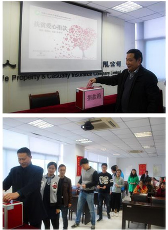 会议首先由公司工会就集团公司在全系统开展向湖北丹江口市、郧西县,广西龙州县、天等县等四个中国人寿定点扶贫地区的 “扶贫爱心捐款”活动进行了宣导;公司总经理助理董如志作动员并带头捐款,现场员工踊跃募捐,这次募捐连同县域单位捐款,共募得善款14200元。